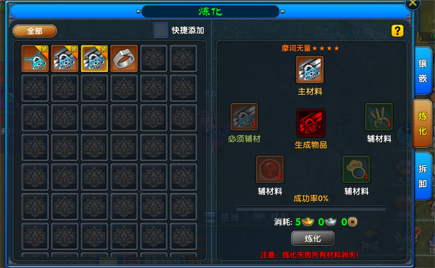 辅材还分为一般辅材和必须辅材,炼化非必定成功,加入的辅材越多成功率越高。但需要注意炼化失败后所有材料都会消失!